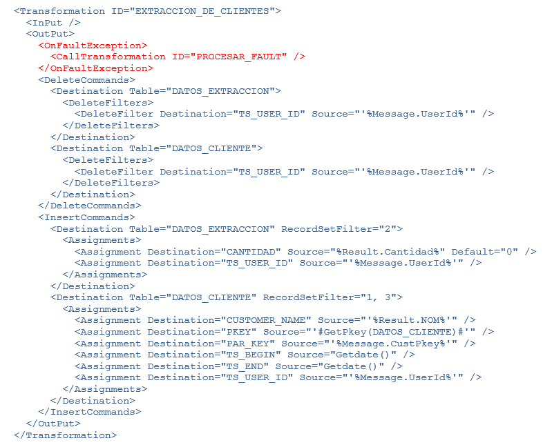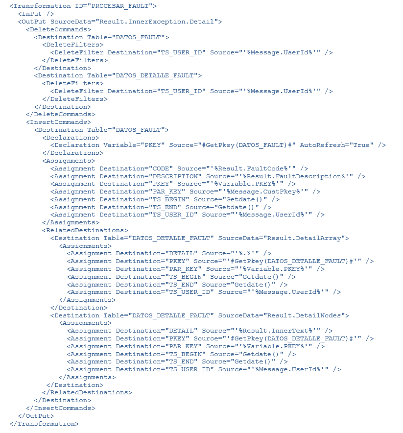 4) Dentro del nodo “OnFaultException”, en el atributo “CallTransformation” se especificó el ID “PROCESAR_FAULT”. Esta nueva transformación se aplicará sobre la estructura clsFaultDetail y funciona como cualquier otra transformación. La ventaja de este método es que si se utiliza la misma estructura para todos los tipos de excepciones de todos los métodos web, entonces sólo habrá que escribir una transformación para capturar las excepciones de todos los métodos web. La siguiente es la transformación referenciada: