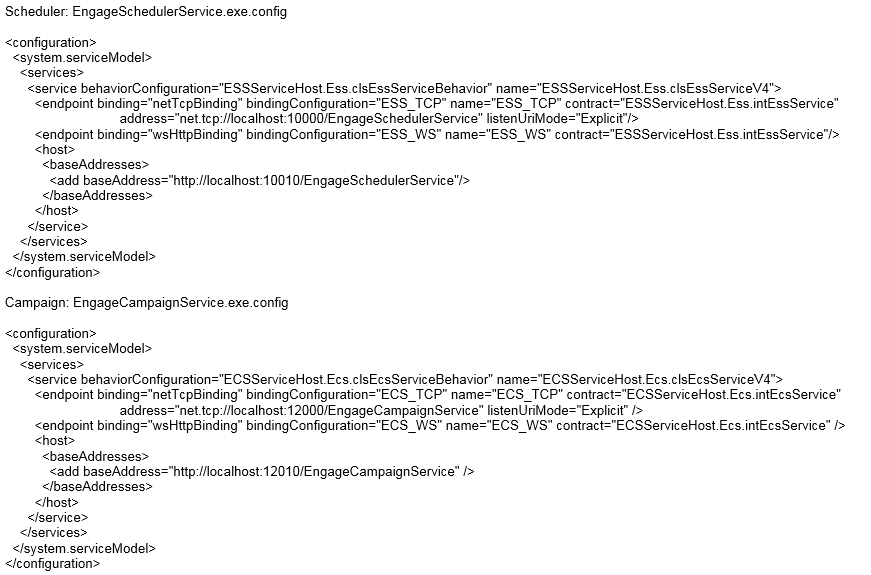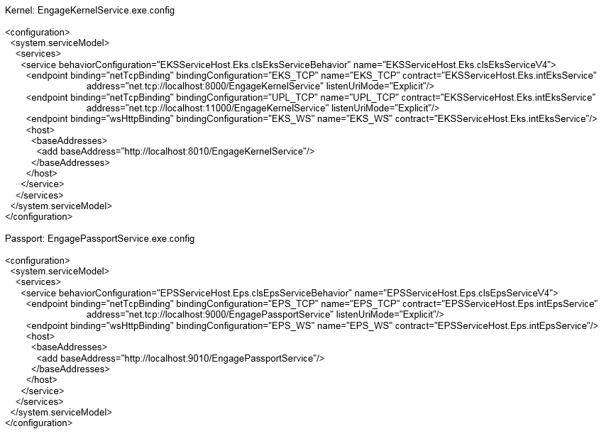 El único servicio que hasta el momento no se expone via WCF es EngageIntegrationServices. La definición del puerto en el que escucha el servicio se encuentra en el archivo EngageIntegrationServices.xml, dentro del nodo “Process”. Como Kernel también es cliente de EngageIntegrationServices en determinadas funciones internas, entonces también hay que mantener actualizado el appSetting con Key=EIS_PORT, dentro del archivo de configuración de Kernel.